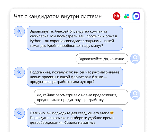 Подходящим кандидатам система сама предлагает время и записывает встречу в календарь - вы в курсе, но без ручной координации.